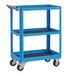 Корпус выполнен из листовой стали толщиной от 0,6 до 1,5мм., покрыт полимерной порошковой краской. Верхняя и средняя полка имеют высоту борта 40мм., нижняя полка имеет высоту борта 60мм. Общая равномерно-распределённая нагрузка на тележку - до 100кг. Размер 800х700х450мм.