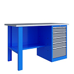 Однотумбовый. Допустимая нагрузка на столешницу 750 кг. Опорные элементы выполнены сварными из холоднокатаной стали. Верстак состоит из столешницы, опоры, тумбы P5 с четырьмя малыми и одним большим ящиком, полки-стенки и одинарного экрана с кронштейнами. Все металлические элементы покрыты полиэфирной порошковой краской. Столешница состоит из фанеры марки ФСФ толщиной 24 мм, которая покрыта лаком-антисептиком и листом оцинкованной холоднокатаной стали толщиной 1,2 мм. Размеры (ВхШхГ) 1470x1396x696 мм.