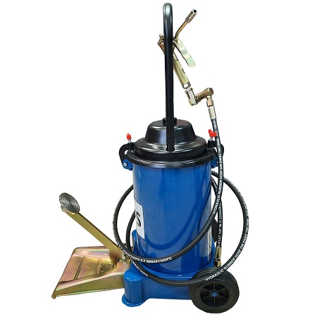 Нагнетатель предназначен для раздачи густой смазки из бочек объемом 190 л. Состоит из 2-х независимых и раздельных насосных систем, что предотвращает попадание отработанной влаги компрессора в емкость с перекачиваемым маслом. Длина шланга: 6 м. Давление смазки: 180-405 бар. Коэффициент передачи давления: 5:1. Производительность: 30 см³/с. Длина раздаточного шланга: 305 см. Вес: 15,5 кг.