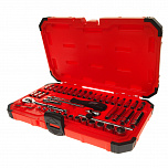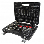 Набор инструментов в чемодане 1/4" & 1/2" 6-гранный 156 предметов. В наборе: головки 1/2", 1/4" (6РТ), головки глубокие 1/2", 1/4" (6РТ), головки TORX 1/2", 1/4", трещотка 1/2", 1/4", удлинитель 1/2", 1/4", кардан 1/2", 1/4", вороток-отвертка 1/4", держатель для бит 1/4", переходник 3/8", свечная головка 1/2" (6РТ и 12РТ), держатель для бит 5/16", вороток с шарниром 380 мм, вороток Г-образный 260 мм, биты 1/4", биты 5/16", ключи рожково-накидной: 6-24 мм, ключи разрезные, Г-образный ключ HEX, пассатижи 7", бокорезы 6", клещи с фиксатором 10", молоток 500 г, набор выколоток и зубил, отвертки с антискользящей рукояткой.
