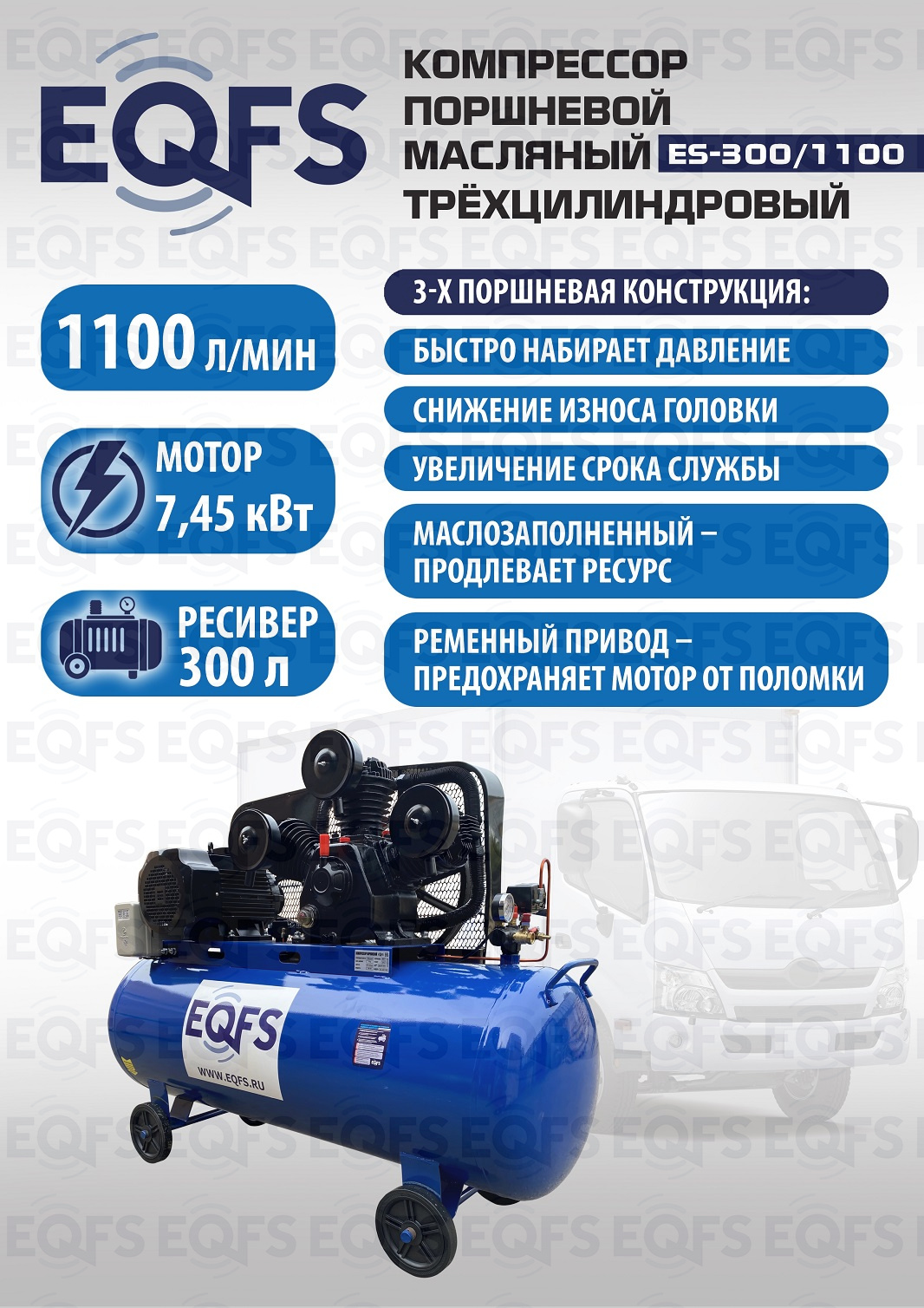 Компрессор воздушный, передвижной, поршневой, масляный, трёхцилиндровый. Быстро достигает нужного давления. Трёхпоршневая головка двигателя уменьшает износ деталей и увеличивает срок службы. Ремённый привод — предохранят мотор от поломки. Идеальное решение для шиномонтажа, автосервиса, строительства, покраски, промышленности. Давление 8 Атм. Производительность 1100 л/мин. Мощность 7,45 кВт. Напряжение 380В. Ёмкость ресивера 300 л. Гарантия 12 месяцев.
