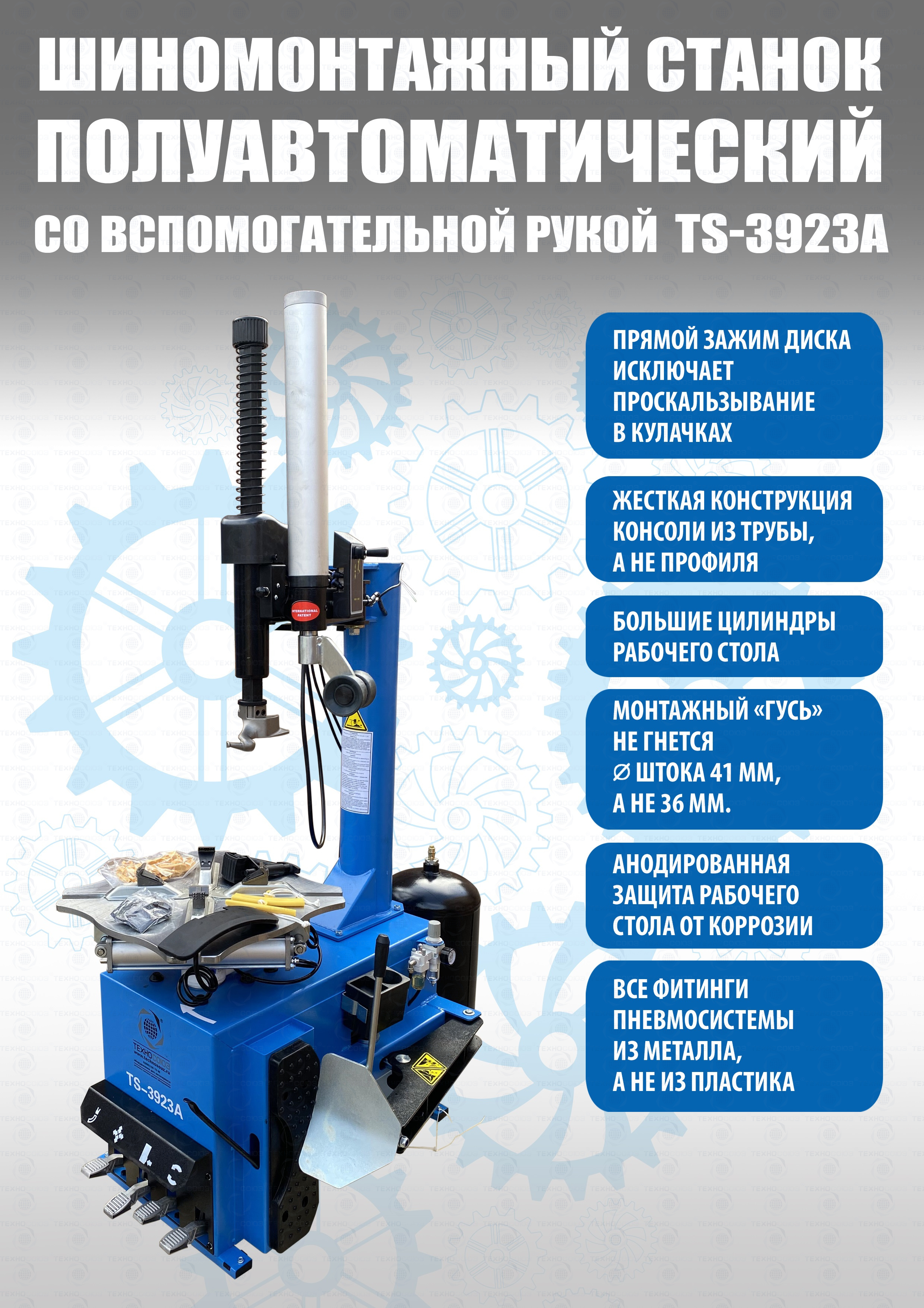 Шиномонтажного станка TS-3923A для колес легковых автомобилей, легких грузовиков. Для дисков: 12÷24”. В комплекте: вспомогательная рука для работы с низкопрофильными шинами и RanFlat + встроенный бустер 24 литра (взрывная подкачка) + пистолет для подкачки шин + монтажка + регулятор давления с влагоотделителем и манометром.