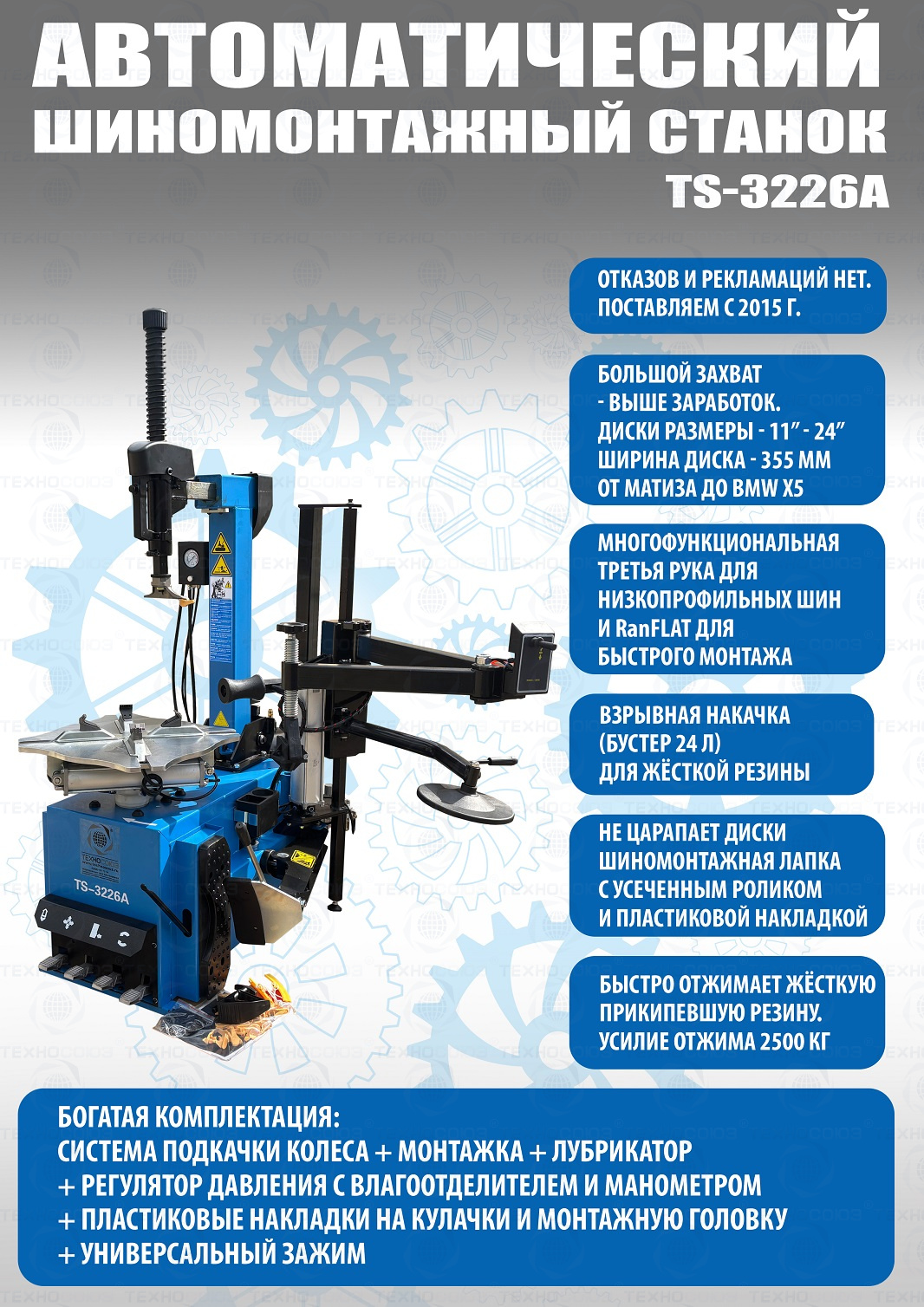 Автоматического шиномонтажного станка TS-3226А для колес легковых автомобилей, легких грузовиков, не больших автобусов и коммерческой техники. Для дисков: 11÷24”. В комплекте: полноценная 3-я рука для работы с жесткой и низкопрофильной резиной RUNFLAT. + встроенный бустер 24 литра (взрывная подкачка) + пистолет для подкачки шин + монтажка + регулятор давления с влагоотделителем и манометром.