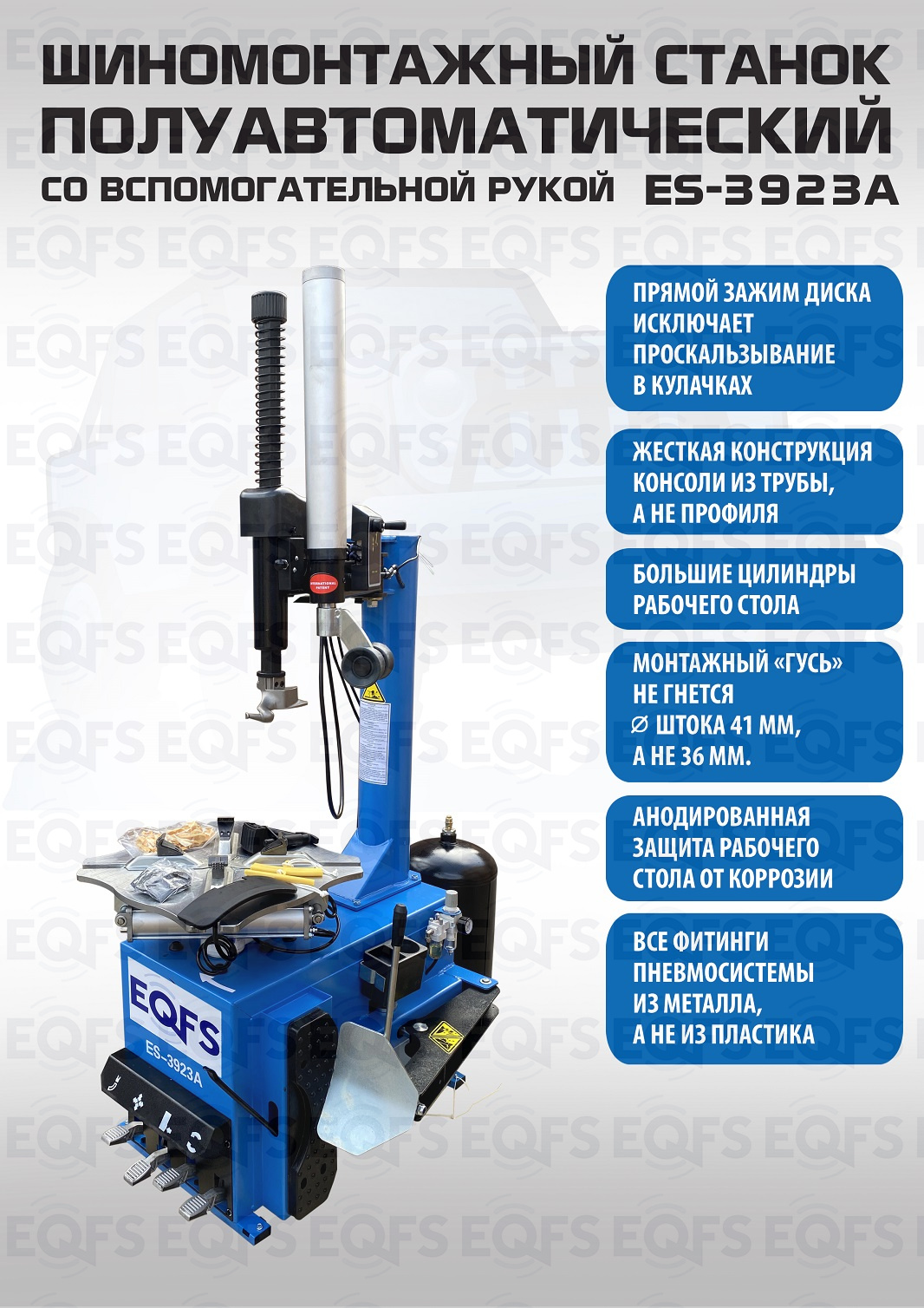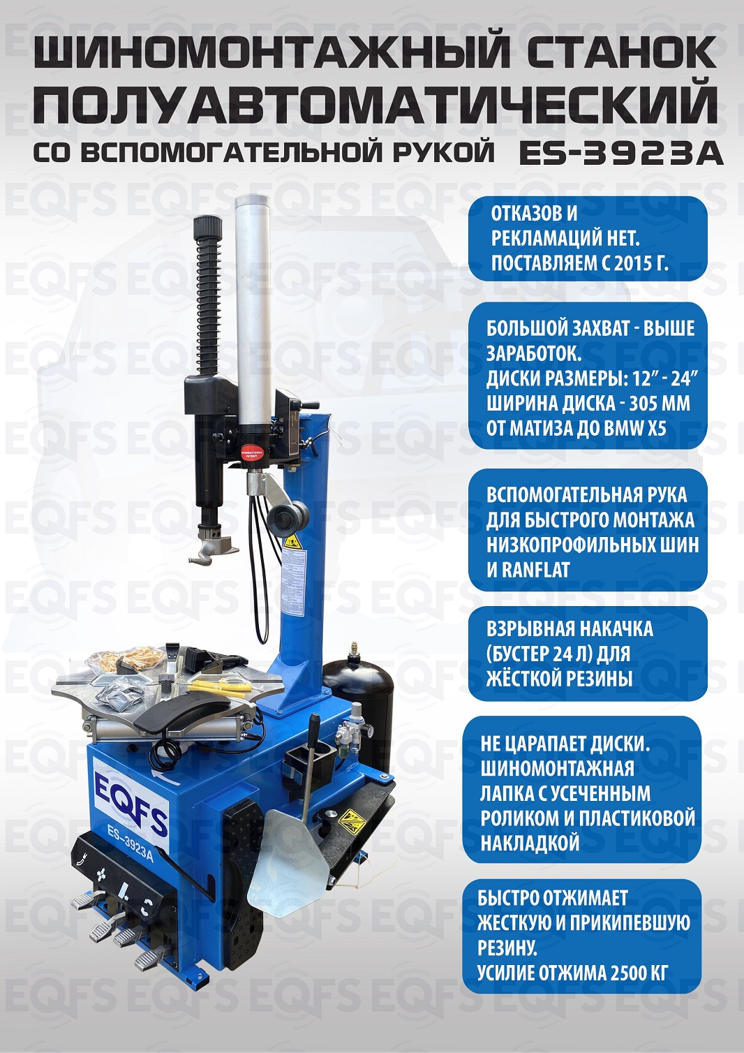 Шиномонтажный станок полуавтоматический ES-3923A. Для больших и широких колес. Комплектуется встроенным увеличенным бустером емкостью 24 литра (взрывная подкачка) + дополнительной вспомогательной рукой для работы с низкопрофильными шинами и RanFlat! Для колес - Внешний зажим 12-22”. Внутренний зажим 13-24”. Напряжение 220В/380В. В комплекте: пистолет для подкачки шин + монтажка + регулятор давления с влагоотделителем и манометром. Напряжение 220В/380В