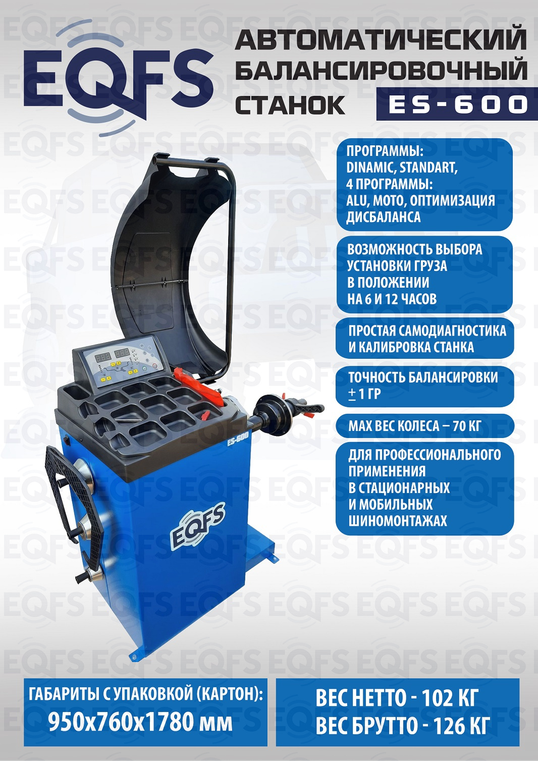 + ES-600 Балансировочный станок. Автомат. Для колес с диаметром диска с резиной до 800 мм. Размеры диска: ширина 3–10” (76-254 мм), диаметр диска 10–24” (254÷609 мм). Вал- 40мм. Гарантия 18 мес – наш монтаж, 12 мес – самостоятельная установка. В комплекте: кожух с автозапуском + клещи + кронциркуль + быстрозажимная гайка + набор конусов.