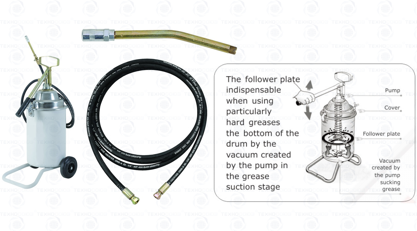 Корпус нагнетателя – стальной, насосный узел изготовлен из анодированной стали. Фиксация насоса с крышкой к баку для смазки производится с помощью металлических защелок с резьбой. Для удобства транспортировки нагнетатель оборудован металлической ручкой в верхней части корпуса. Нагнетатель оборудован маслобензостойким армированным шлангом длиной 2,5м.