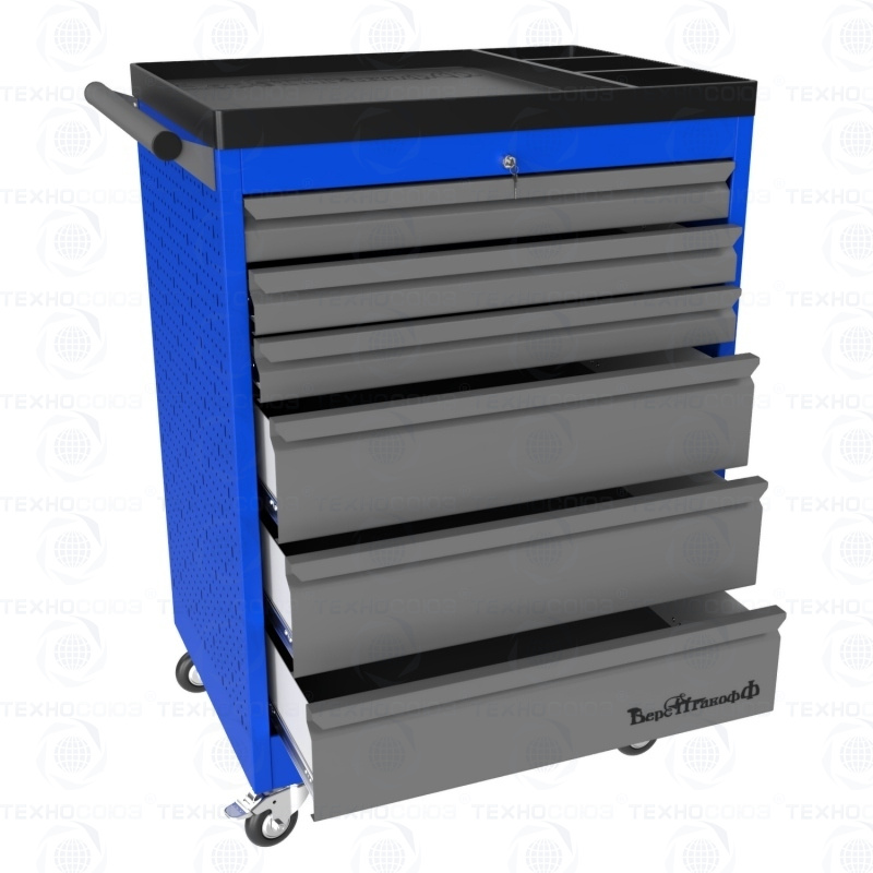 Тележки инструментальные серии PROFFI 950 предназначены для использования на предприятиях любого профиля занятых ремонтом и изготовлением различной продукции. На боковые стенки инструментальной тележки нанесена перфорация размером 25х25 мм и диаметром отверстия 8 мм, что позволяет устанавливать на них навесной инструмент или крючки. Наибольшей популярностью тележки инструментальные пользуются в сфере авторемонта и обслуживания автомобилей .Тележки имеют выдвижные ящики на шариковых телескопических направляющих полного выдвижения с фиксацией в закрытом положении, предотвращающее открывание при передвижении тележки. Ящики имеют центральный замок, который позволяет ограничить доступ посторонних лиц к содержимому ящиков. Тележка инструментальная изготовлена из высококачественного металла ведущих Российских производителей, покрашена порошковой краской производства Германии, имеет итальянскую и турецкую фурнитуру. Тележки для инструмента оснащены двумя не поворотными колесами диаметром 100 мм, одним поворотным и одним поворотным со стопором, которое фиксирует тележку и предотвращает непроизвольное скатывание.