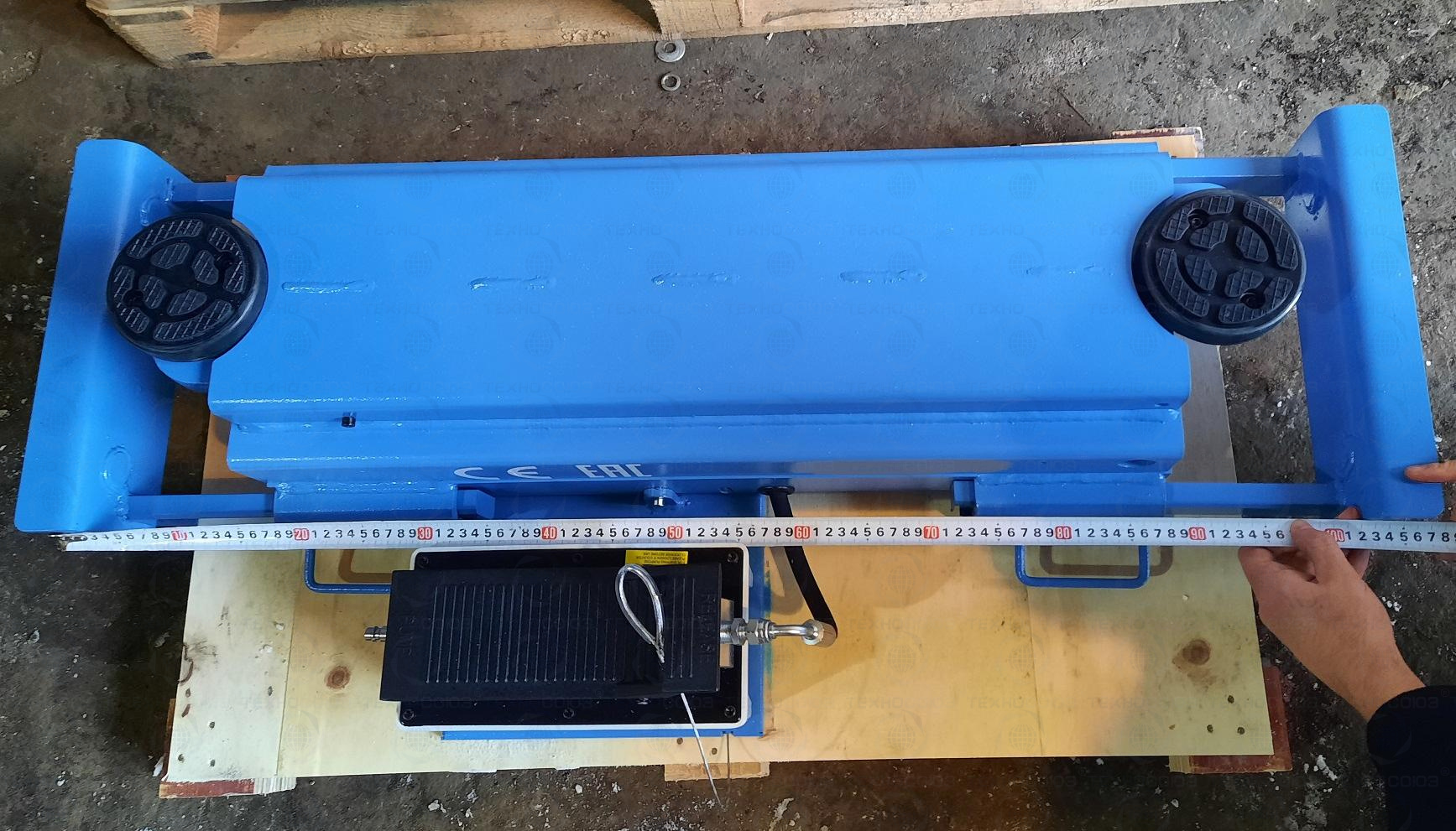 Пневмогидравлический привод насоса позволяет точно регулировать высоту подъема. Подъемник канавный снабжен стопорным механизмом, который предотвращает падение автомобиля во время проведения работ.