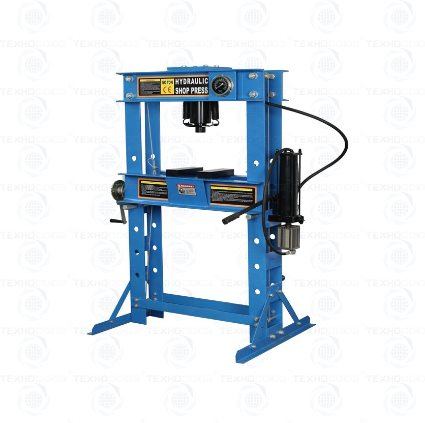 Пресс гидравлический, ручной, гаражный  для автосервиса, усилие 50т. Предназначен для запрессовки/выпрессовки подшипников и т.п. в условия автосервиса, мастерских по ремонту лодочных моторов и т.п. Передвижная рабочая площадка с фиксаторами – может опускаться и подниматься.