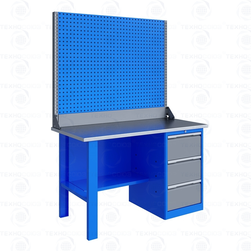 Однотумбовый. Допустимая нагрузка на столешницу 750 кг. Опорные элементы выполнены сварными из холоднокатаной стали. Для выполнения сборочных, ремонтных, слесарных, монтажных и других видов работ на производстве, в сервисных центрах, мастерских, гаражах, а также для обучения технологии в учебных заведениях. Комплектуется полкой-стенкой, расположенной под столешницей для удобного размещения габаритного инструмента и оснастки. Размеры верстака: 855x1396x696 мм. Вес: 76 кг. Поставляется в 4 комплектациях на выбор.